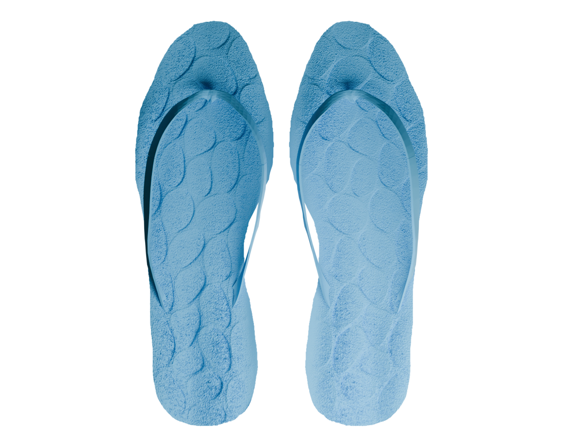 Formed by pressing a cushion-and-grip pattern into foam, the sandal has soft basins on top for comfort and a gently raised tread underneath for traction.